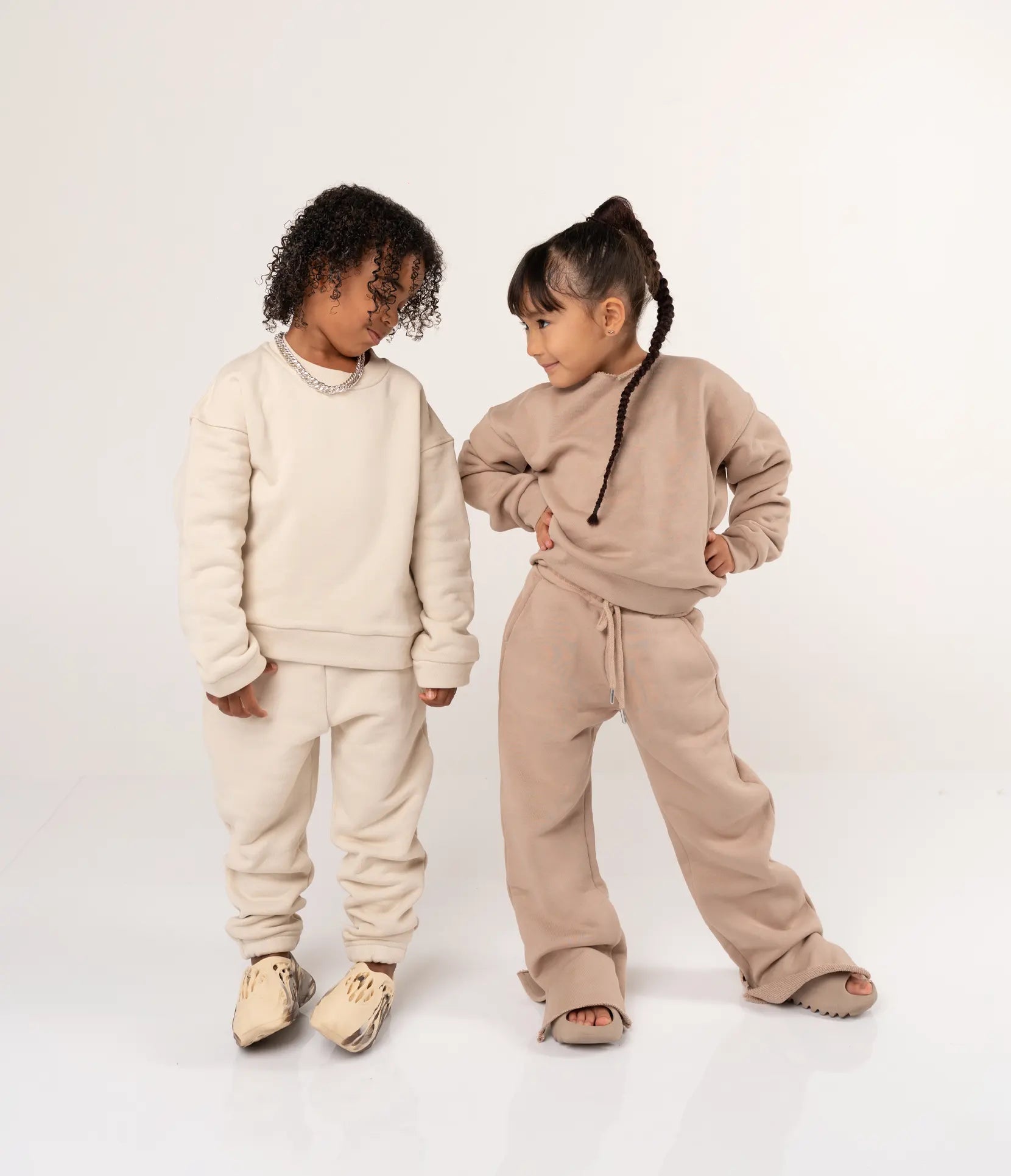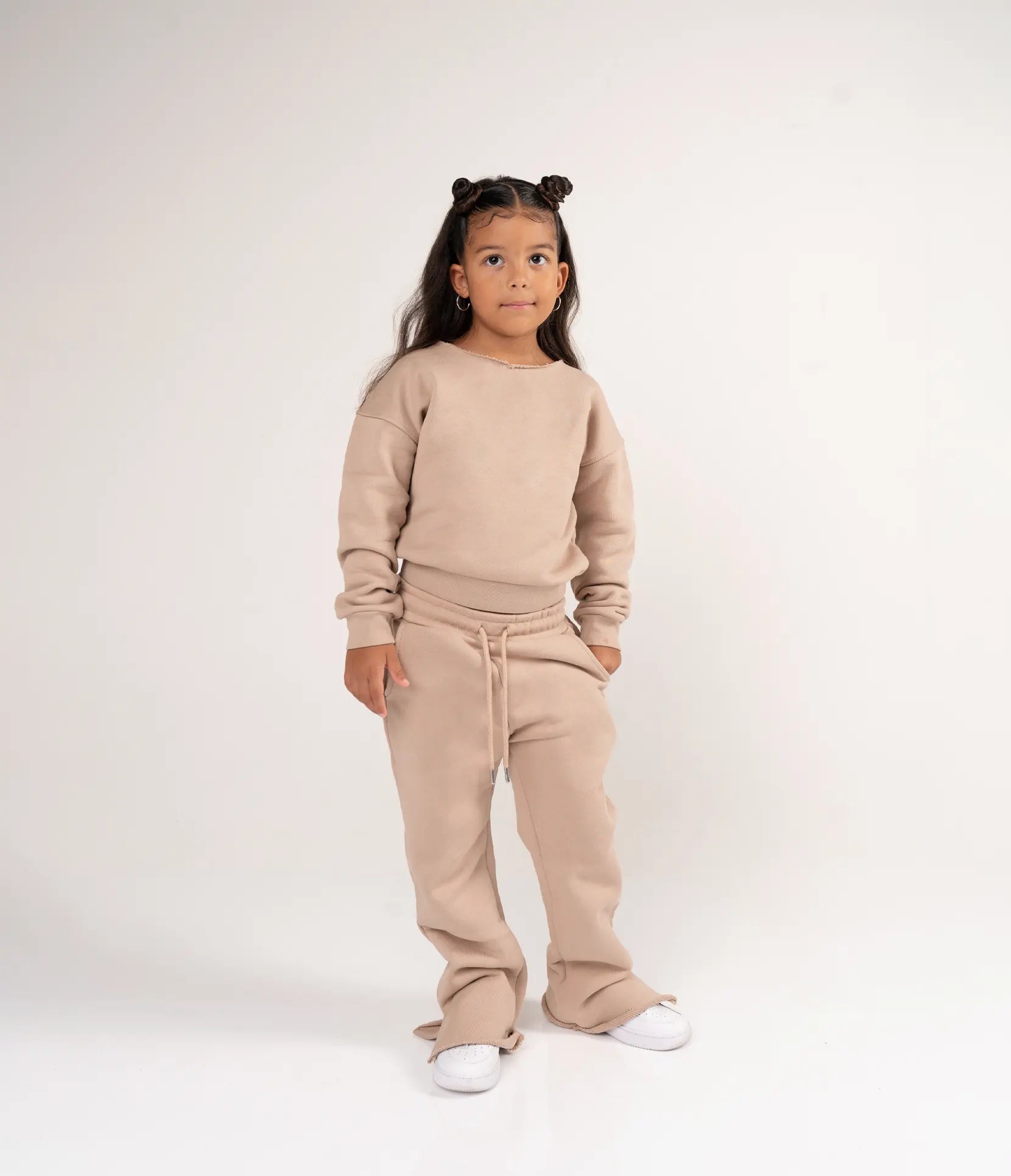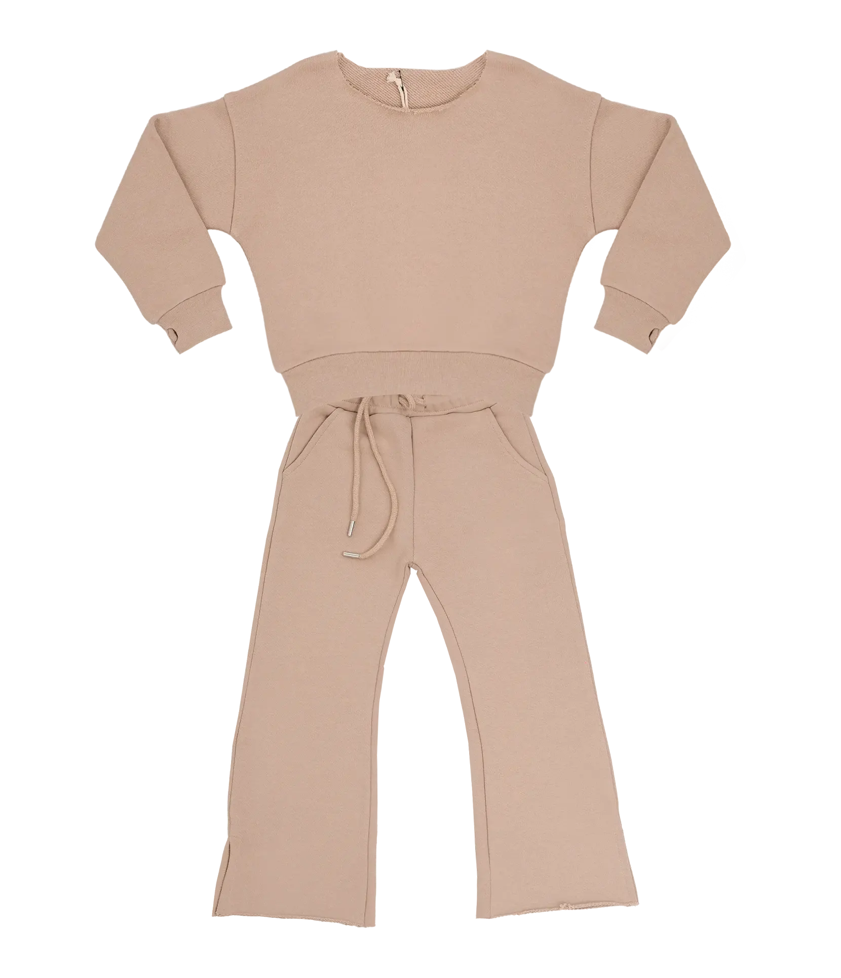 The Toffee Sweater has a slimmed cropped fit with a rough edged collar and cutout detail on sleeves. Mix and match it with the Toffee flare pants. The Toffee Pants feature an elastic waistband with adjustable drawstrings and side pockets. The wide leg jogger pants have a flared fit with split detail. Made from 100% organic cotton. The material is soft and cosy, making it a definite musthave. A sporty-chic and versatile look appropriate to wear as lounge or street wear.