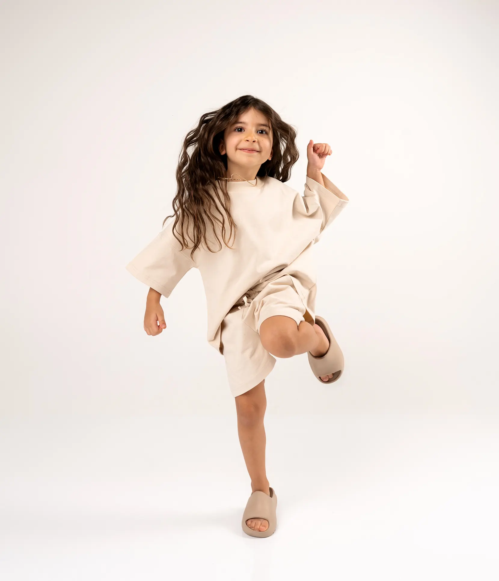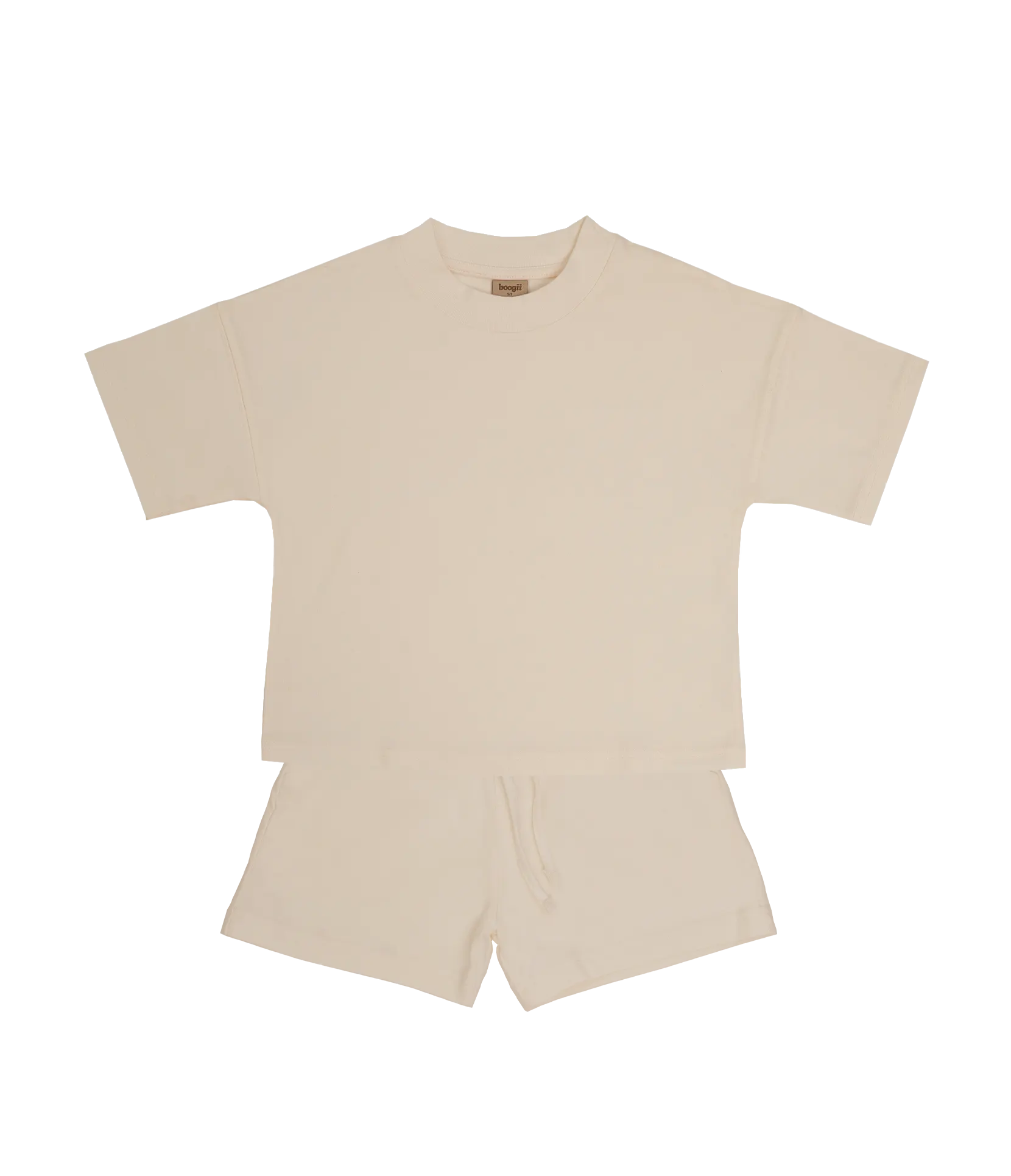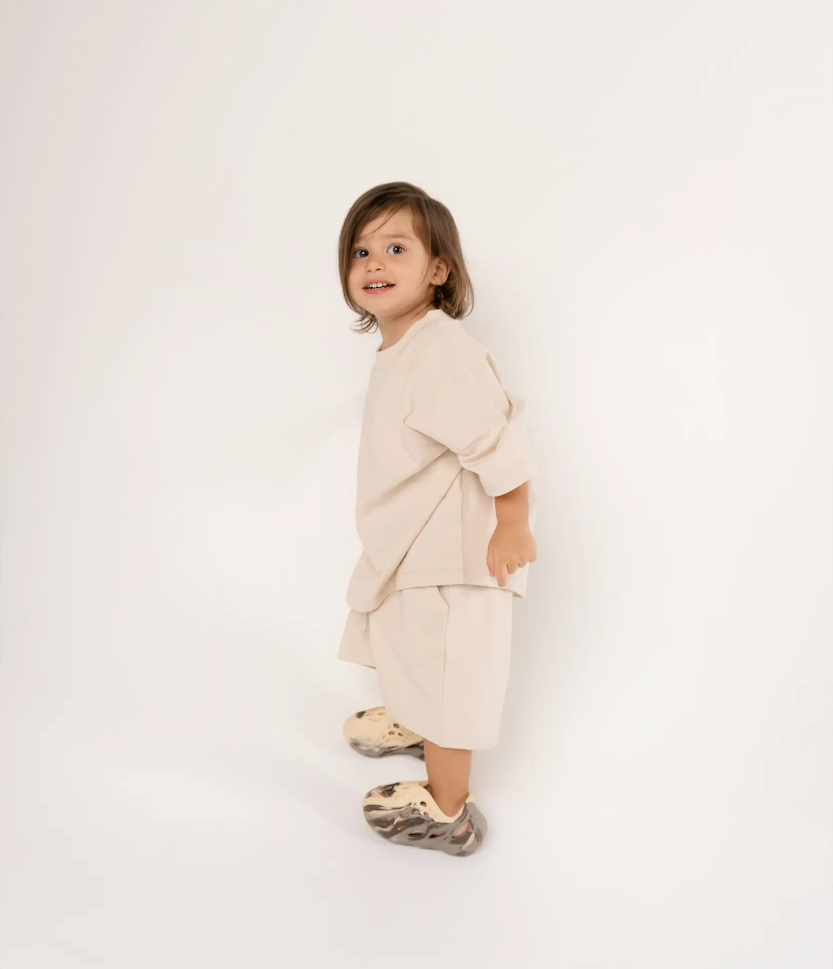 The Butter Milk Heavy Set has an ultra oversized and comfy fit. Made from 100% heavy weight organic cotton. The material is sturdy and resistant. The Shorts featuring an elastic waistband with adjustable drawstrings and side pockets. The T-shirt has 3/4 length sleeves creating a box shaped silhouette. Available in two colours, the relaxed fit will give your kids the space to move freely.