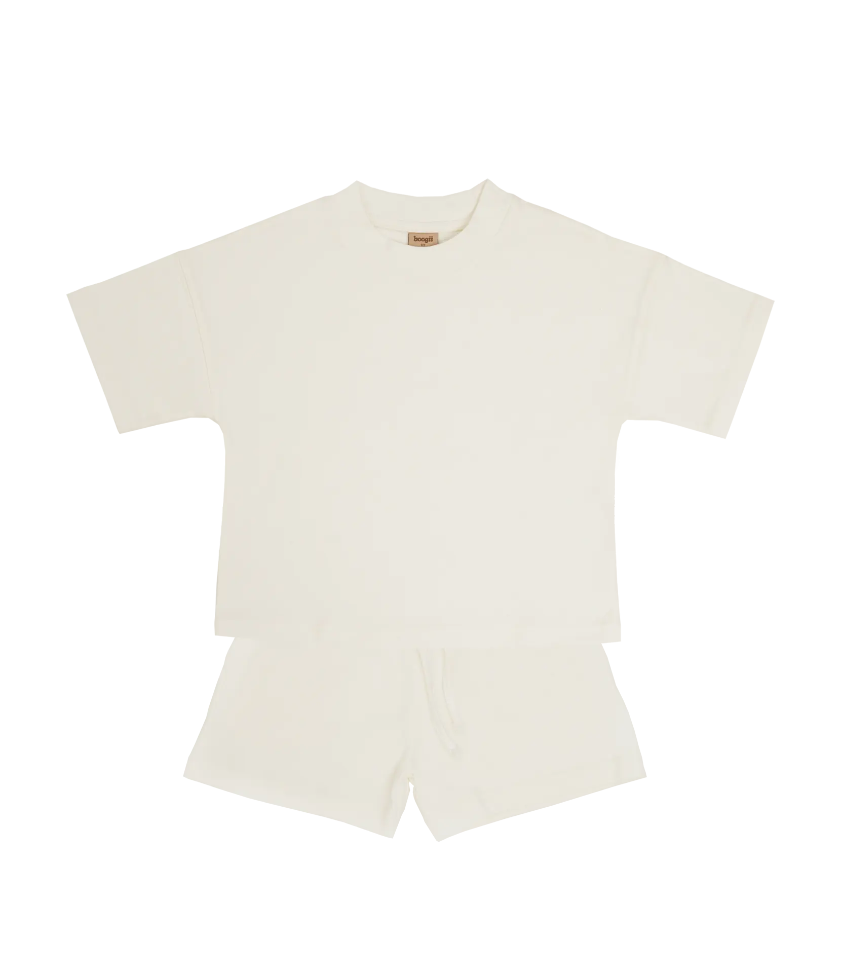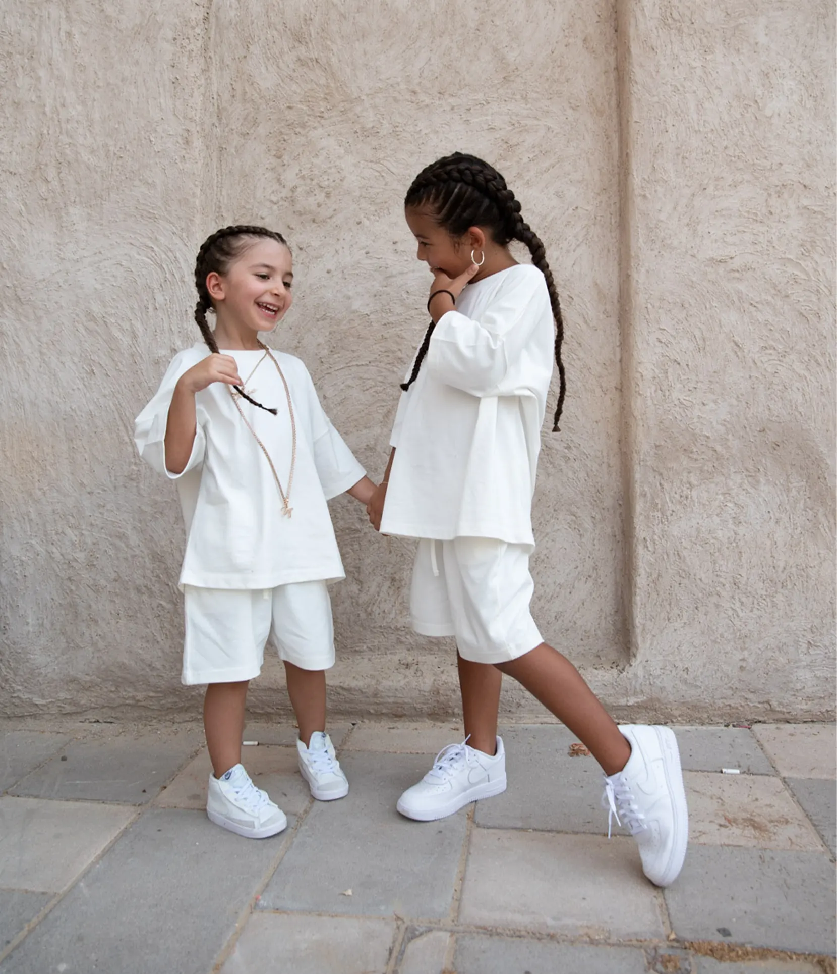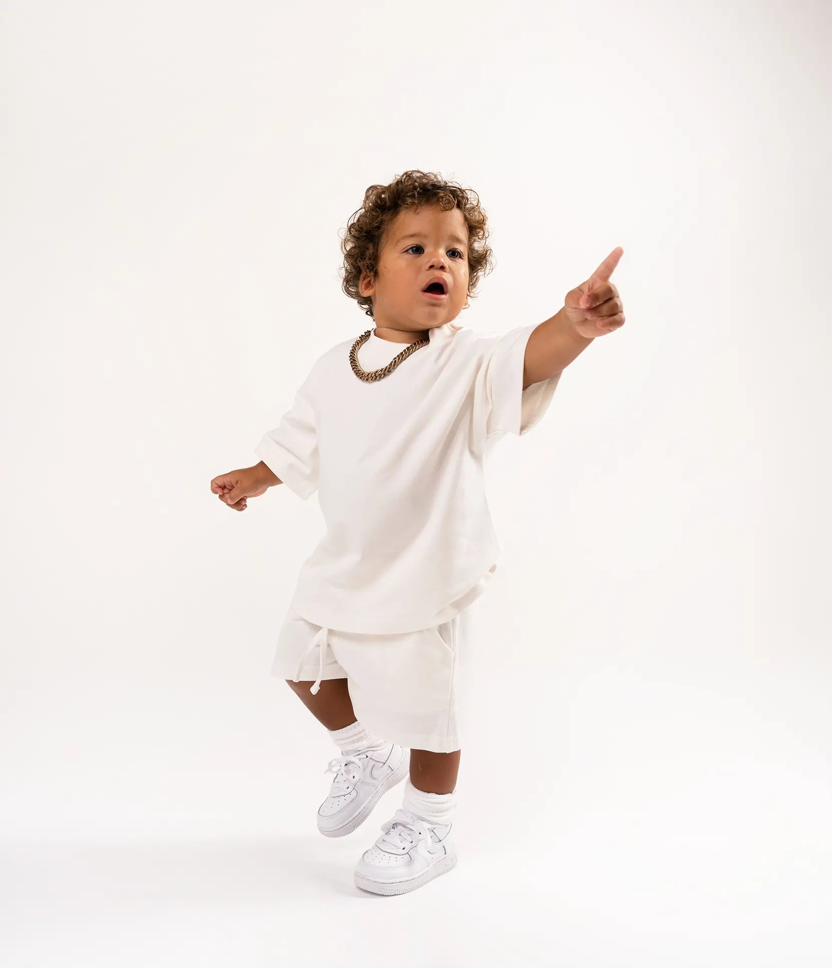 The Marshmellow Heavy Set has an ultra oversized and comfy fit. Made from 100% heavy weight organic cotton. The material is sturdy and resistant. The Shorts featuring an elastic waistband with adjustable drawstrings and side pockets. The T-shirt has 3/4 length sleeves creating a box shaped silhouette. Available in two colours, the relaxed fit will give your kids the space to move freely.